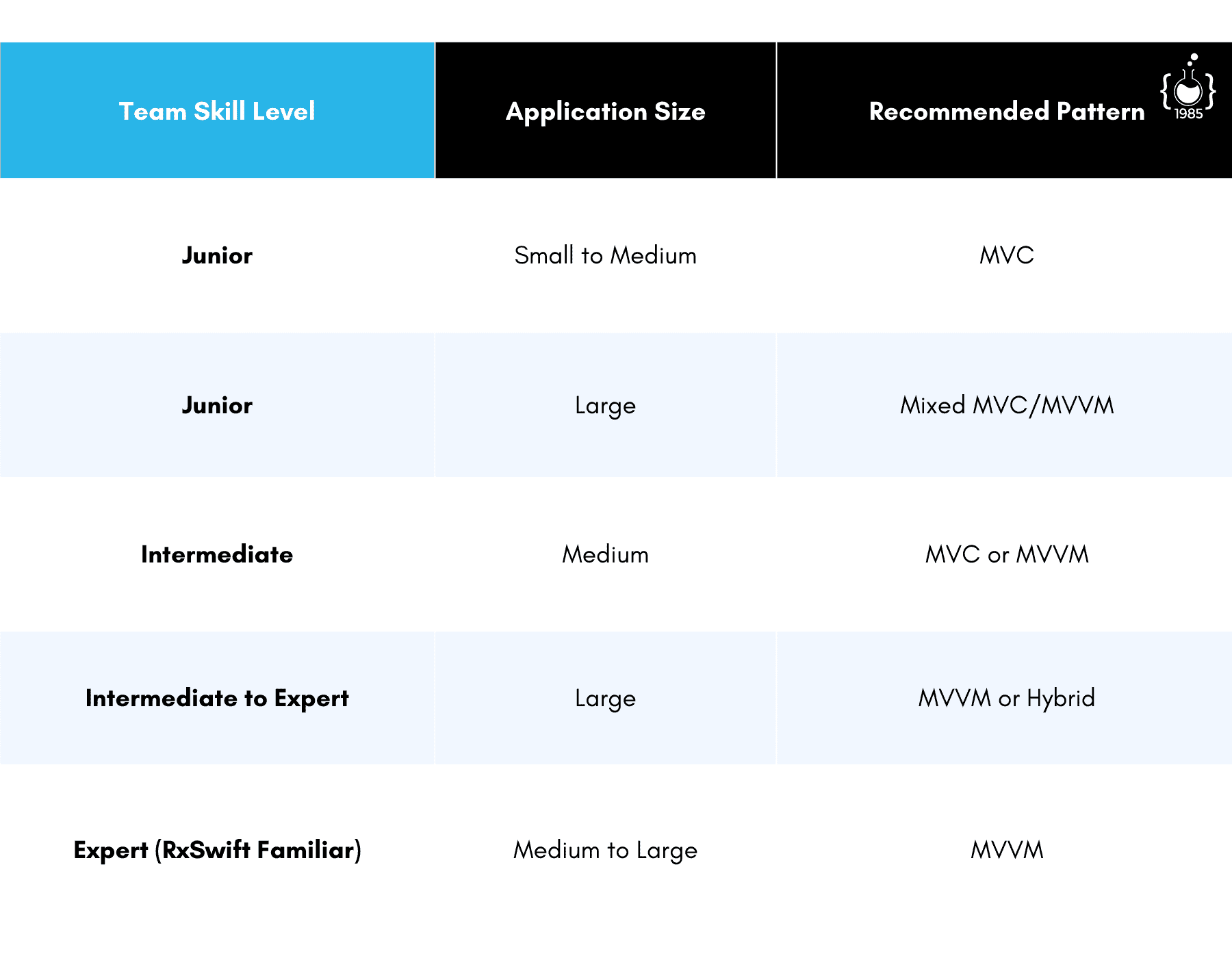 Your team’s experience with architectural patterns should be a key deciding factor. In our experience at 1985, when working with teams that are less experienced or ramping up quickly, we’ve found that sticking with MVC can be a lifesaver. Why? Because the simplicity of MVC aligns perfectly with developers still learning the ropes of app architecture.